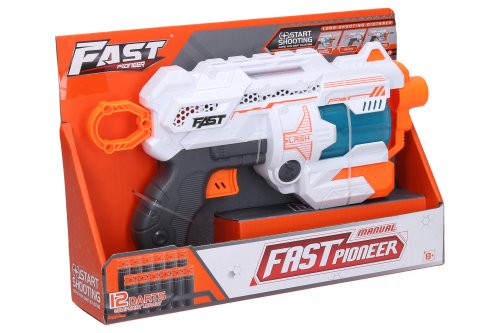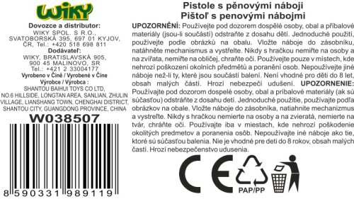 Pistole s 12 pěnovými náboji. Rozměry 25x6x14 cm. Natahovací nabíjení. Obrázkový návod na použití na přední straně obalu.