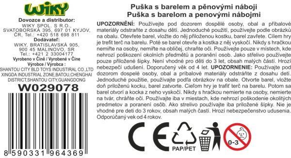 Pistole s barelem 21 cm. Součástí pistole, barel, kostka, 12 pěnových nábojů. Vložte kostku do barelu. Trefením terče kostka z barelu vyskočí.