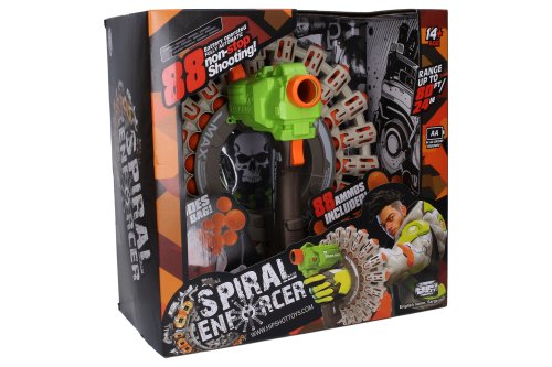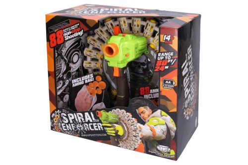 Pistole Spiral Enforcer s míčky. Rozměry 34,5x34,5x17,5 cm. Součástí 88 míčků, pytlík na míčky. 6xAA baterie nejsou součástí. Dostřel až 24 m. Náhradní míčky W049343.