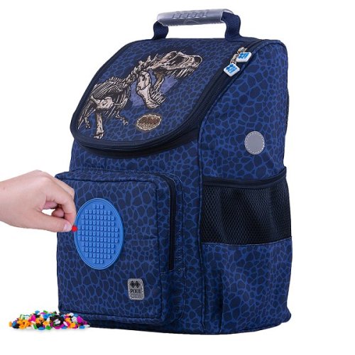 Funkční a stylová školní aktovka od PIXIE CREW s obrázkem dinosaura je ideální pro každodenní školní potřeby. Nabízí polstrovaná záda a nastavitelné popruhy, které zajišťují pohodlí a ergonomickou podporu pro rostoucí záda dětí. Hlavní velké oddělení aktovky je uzavíratelné zipem v horní části a poskytuje dostatek místa pro knihy, sešity a školní potřeby. Přední kapsa na zip je ideální pro uložení svačiny nebo jiných drobností. Boční kapsy jsou praktické pro rychlý přístup k pití nebo malým předmětům. Aktovka je také vybavena reflexními prvky pro lepší viditelnost a bezpečnost dítěte na cestě do školy a zpět. Pro pohodlné přenášení v ruce je aktovka vybavena polstrovaným úchytem s ergonomickým chráničem, pro zavěšení slouží pevné poutko. Dno aktovky je opatřeno dvěma chráničkami proti oděru a je vyztužené, což částečně zabraňuje deformaci obsahu. Na přední straně aktovky je umístěn unikátní silikonový PIXIE CREW creative panel TM červené barvy. Kruh je o průměru 9 cm a k dispozici máte 86 bodů pro nekonečné množství motivů na každý den díky PIXIES (pixelům), které můžete kdykoli sundat a vyměnit za jiné. Ke každé aktovce zdarma přikládáme balíček přibližně 55 ks malých PIXIES (pixelů), 10 malých PIXIES (pixelů) s písmeny, 4 multipixely (pixel o vel. 2x2 body) s obrázky a mini galerii pro inspiraci. Můžete také čerpat na stránkách pixiecrewgallery. Rozměr: 20x27x38 cm. Věk 6+