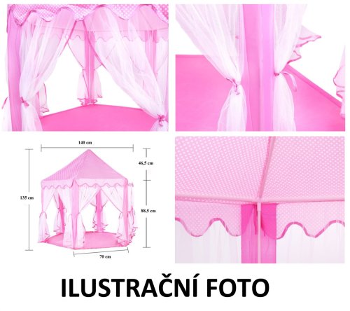 Stan má konstrukci z odolných plastových tyčí a spojů, díky kterým vše snadno spojíte dohromady. Konstrukce stanu je krytá jemnou a lehkou látkou v růžové barvě se světlejšími puntíky. Boční strany herního stanu tvoří jemná síťovina, která může být dekoračně uvázána ke stojkám nebo spuštěna a chránit před hmyzem či vytvořit iluzi soukromí.