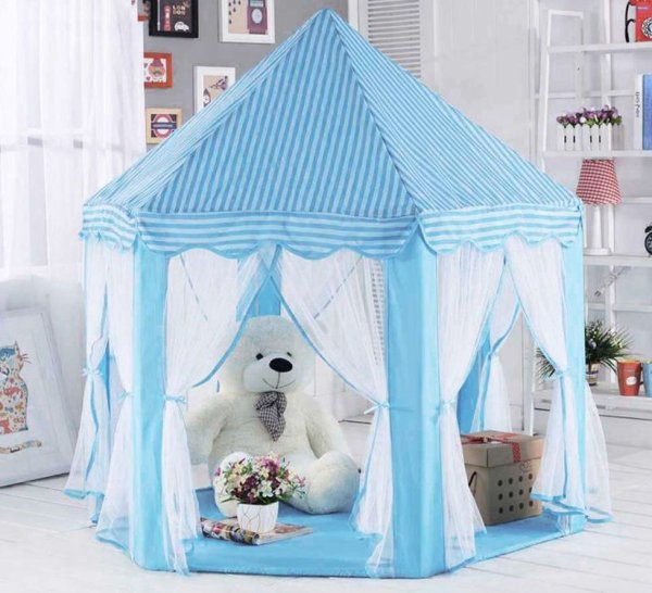 Krásný modrý stan vhodný na zahradu i do interiéru. Díky pastelovému tónu se bude hodit do dětského pokojíku a vytvoří kouzelný herní nebo odpočinkový koutek.