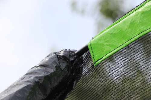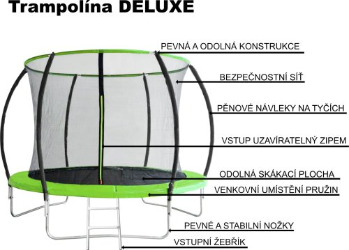 stabilní nohy ve tvaru písmene U odrazová plocha z kvalitního materiálu vnitřní bezpečnostní síť (brání doskoku do části s pružinami) vstupní otvor se zipem ocelová obruč bezpečností sítě elipsovité tyče ochranné sítě s bezpečnostním pěnovým krytem vnější umístění pružin s ochranným krytem kovový žebřík pro domácí venkovní použítí