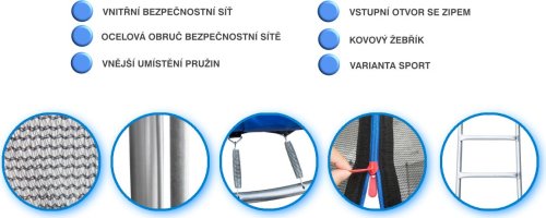 stabilní nohy ve tvaru písmene U odrazová plocha s hladkou povrchovou úpravou a s ochranou proti UV záření je vyrobena ze speciálního polypropylenu vnitřní bezpečnostní síť (brání doskoku do části s pružinami) vstupní otvor se zipem ocelová obruč bezpečností sítě tyče ochranné sítě s bezpečnostním pěnovým krytem vnější umístění pružin s ochranným krytem kovový žebřík pro domácí venkovní použití