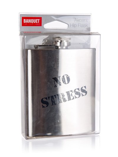 Nerezová placatka AKCENT s potiskem ''No Stress', o objemu 203 ml (7oz) je vhodná na mošty a lihové nápoje. Díky svému tvaru je placatka skvělým společníkem na cesty.