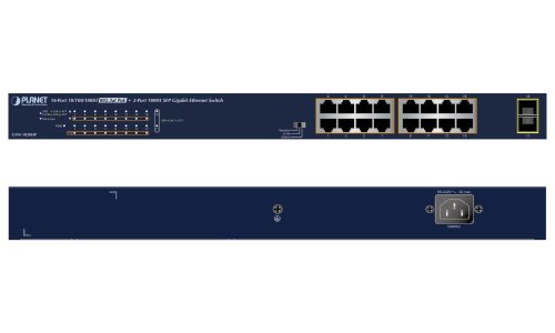 Gigabitový PoE+ přepínač, 16 x 10/100/1000Base-T RJ-45 s injektory 802.3af/at, dva SFP sloty 1000Base-X, napájecí výkon až 240 W.