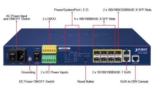 Administrovatelný IPv4/IPv6 switch, 8 pozic pro SFP moduly (2× 100/1000/2500BASE-X + 6× 1000BASE-SX/LX/BX), podpora SFP-DDM 2× RJ-45 (10/ 100/1000BASE-T), 2× DI + 2× DO a konzolový port (RJ-45 serial - DB9).