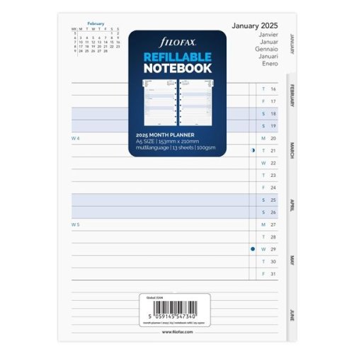 Kalendář do zápisníku Filofax Notebook Měsíční přehled v anglickém jazyce Formát A5, 26 listů, 100 g/m² Kalendárium pro rok 2025