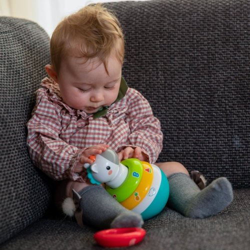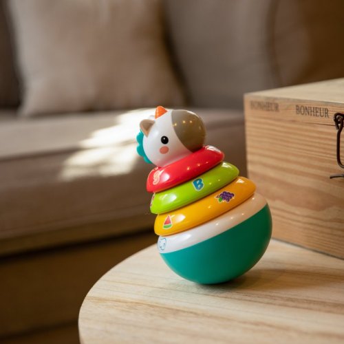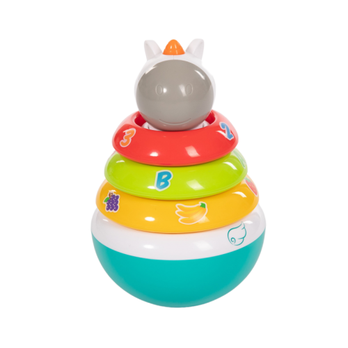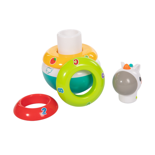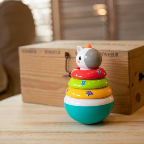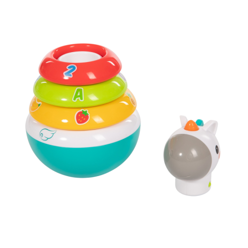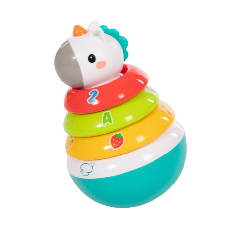 • hračka je tvořena kývající se základnou s kolíkem, 3 chrastícími, barevnými kroužky a hlavičkou Unicorna
