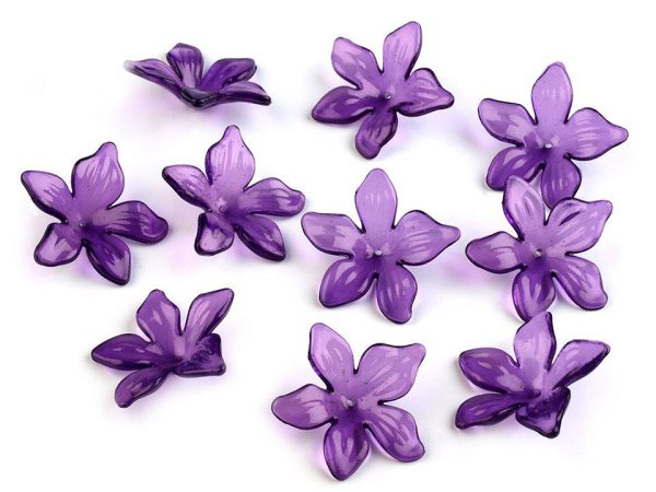 [Půvabný plastový květ v transparentních barvách nadchne především korálkářky, které rády tvoří květinové šperky. Je velice lehký, vhodný i na náušnice. Květ můžete využít jako sukýnku k výrobě ketlovaných andělíčků, viz naše ilustrační foto. Na našem specializovaném webu najdete detailní fotonávod na výrobu andělíčků.]