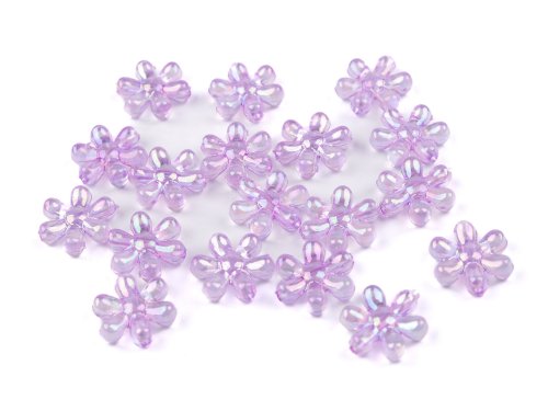 Plastové korálky ve tvaru květu nadchnou děti i dospělé. Jsou doslova magické, protože jsou transparentní, ale jejich povrch má vysoký lesk s AB efektem. Našim fotografům se fotografie velmi povedly, ale věřte, že ve skutečnosti jsou korálky ještě zajímavější. Korálky můžete použít na výrobu náhrdelníků, náramků, přívěsků ke klíčům apod. Průvlek je umístěný skrz celý korálek - od špičky lístku středem do špičky protějšího lístku - po navlečení se květiny řadí naplocho vedle sebe. Balení 10 g obsahuje cca 18 ks korálků.