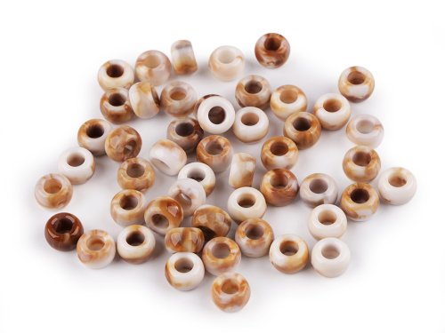 Žíhané plastové korálky s velkým zaobleným průvlekem jsou zajímavé svým probarvením imitujícím mramor, kdy každý korálek je jiný. Jemně se lesknou, jsou velice příjemné na pohled, působí přírodním dojmem. Jsou velice kvalitní, všude hladké, nemají žádné otřepení nebo viditelné švy. Využijete je na výrobu bižuterie i různých dekorací, např. lapačů snů. Skvěle se kombinují s dalšími korálky různých tvarů a materiálů. Korálky využijete i ke zdobení oděvů, tašek nebo plavek. Korálky jsou vhodné pouze pro šetrné ruční praní. Balení 20 g obsahuje cca 73 ks korálků.