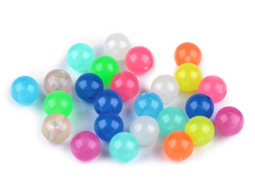 Barevný mix plastových korálků svítících ve tmě zaujme všechny příznivce diskoték a nočních party. Stačí je přes den nechat ležet na světle nebo nosit na slunci, aby se světelně nabily a ve tmě budou samy zářit. Přes den oceníte jejich poutavou poloprůsvitnou barvu. Používají se do krátkých i dlouhých náhrdelníků a náramků. Jejich velkou výhodou je lehký materiál.
