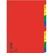 Plastové rozlišovače vyrobené z ekologického polypropylenu Počet rozlišovačů v sadě: 10 Index: 1 - 10 (2 x 5 barev záložek) Počet děr: 11 Formát: A4 Rozměr: 23,0 x 29,7 cm Barva: červená