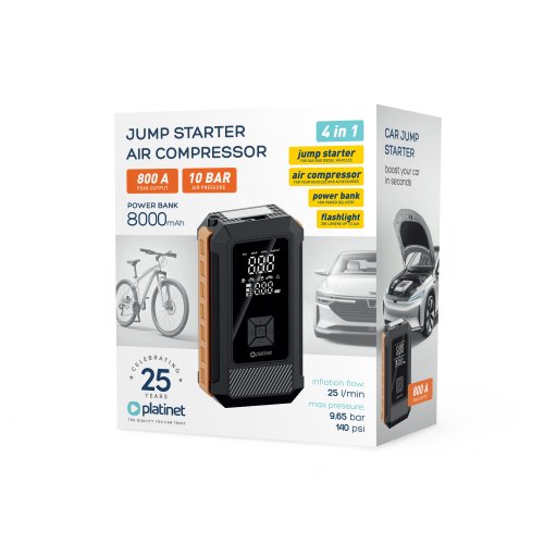 KLÍČOVÉ VLASTNOSTI: • Výkonná baterie 8000 mAh – několik startů vozidel v nouzových situacích • Vysoký špičkový výkon 800 A – startuje benzínové motory do 6,0 l a dieselové motory do 3,0 l • Kompresor 140 PSI / 9,65 BAR – rychlé nafouknutí pneumatik, míčů, jízdních kol a nafukovacích matrací • Kapacita 25 l/min – šetří čas a rychle doplňuje vzduch • Multifunkční LCD displej – přehledné provozní parametry • Nouzové osvětlení COB 200 lm – ideální v noci a v nouzových situacích • USB port 5 V/2 A – nabíjí chytré telefony, tablety a příslušenství • Více než 300 nabíjecích cyklů – odolnost a spolehlivost