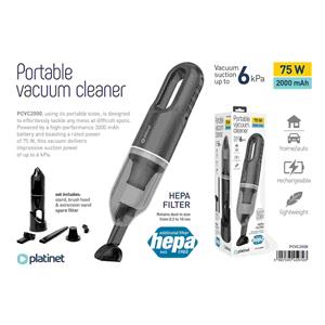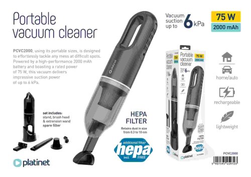 "PCVC2000 - potěší sacím výkonem až 6kPa a vysaje tak prach z těžko přístupných míst. Baterie 2000mAh zajistí přibližně 10-20 minut vysávání, dle použitého výkonu. Disponuje HEPA filtrem pro svěží čistotu, kapacitou nádoby na prach 100ml, praktickým stojanem a řadou nástavců v podobě plochého kartáče nebo kartáče s dlouhou tryskou.