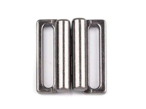 Kovové zapínání na plavky je složené ze dvou dílů a zapíná se vsunutím jednoho dílu mezi druhý díl. Rozměry jednoho dílu spony jsou 15 x 24 mm.