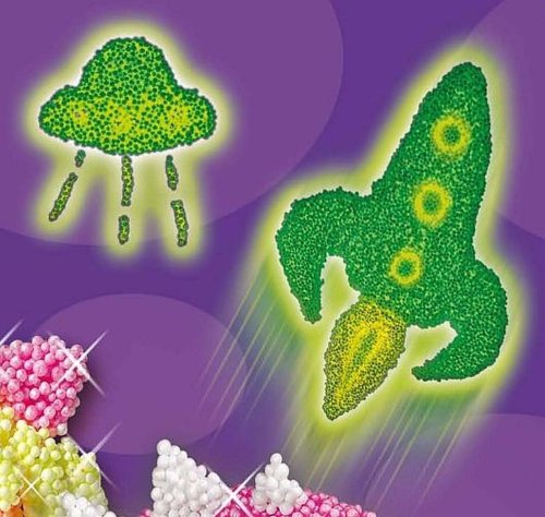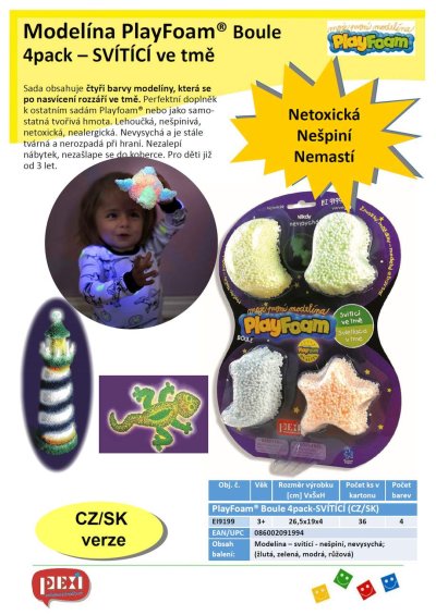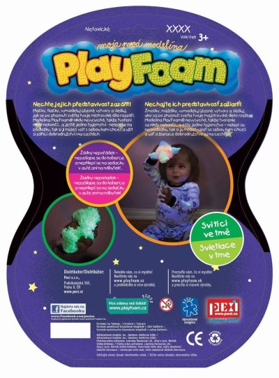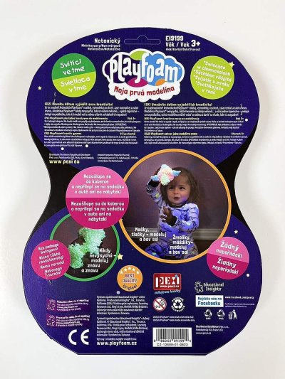Balení se čtyřmi barvami fosforeskující modelíny zářící ve tmě, která se nepřilepí k podkladu ani se nezašlape do koberce. Lehoučká, nešpinivá, netoxická modelína nevysychá a zůstává stále tvárná. Díky tomu s ním můžete modelovat stále dokola. Najvyšší kvalita použitého pojiva zaručuje, že modelína drží stále pohromadě i po mnoha hodinách hraní. Nerozpadá se, je netoxická, nešpiní a nemastí. Děti vytvoří vše co je napadne a uklizeno máte za okamžik. Žádný nepořádek, spousty legrace - a tmy už se nebudete bát! A protože se modelína PlayFoam® nelepí na stůl, koberec ani sedačky, můžeš si jí s sebou vzít kam chceš a užít si zářící dobrodružství i na cestách!