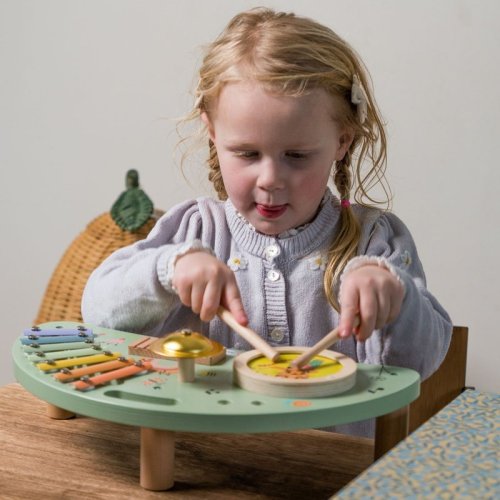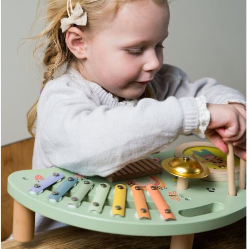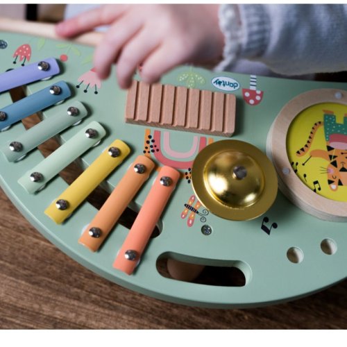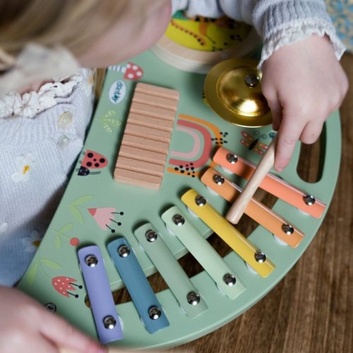 dřevěná hudební stanice se základnou obsahující hudební nástroje (xylofon, zvonek, bubínek)