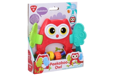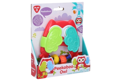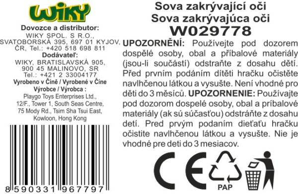 Sova zakrývající oči. Rozměry 18x2,5x11,5 cm. Pohybující cvakající křídla, otáčející oči, 2 kroužky.