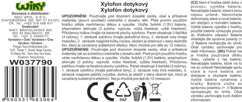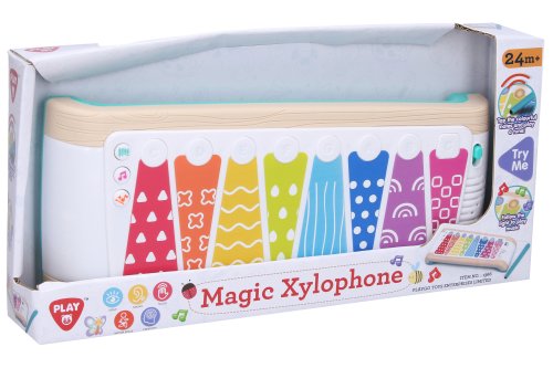 Playgo xylofón dotykový. Rozměry 31x13,5x5,5 cm. Součástí je hůlka spojená s xylofónem provázkem. Světelné a zvukové efekty. 3 tlačítka - obrázek xylofónu - jednotlivé tóny kláves, obrázek noty - melodie, obrázek magické hůlky - výuka, úkolem je stisknout v daným okamžik rozsvícenou klávesu. 3xAAA baterie součástí. Přepínač OFF/nízká hlasitost/vysoká hlasitost.