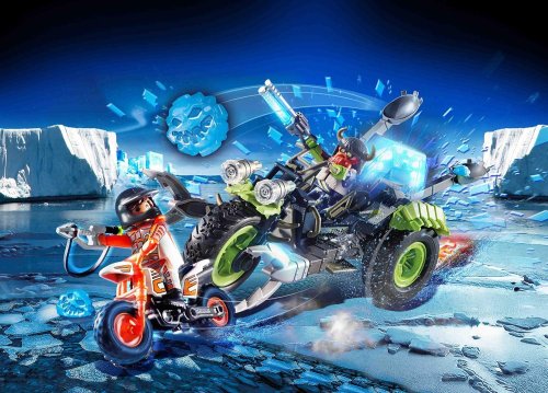 Ledová tříkolka arktických rebelů pronásleduje tajného agenta na motorce. Z katapultu na něj pálí ledové koule. Ledový portál se zvukovými a světelnými efekty.Provoz efektů zabezpečují 2 x 1,5 V AAA baterie ( nejsou součástí balení ). Balení obsahuje: 2 figurky, tříkolku, motorku a mnoho dalších doplňků. Vhodné pro děti od 6 let. Téma: PLAYMOBIL® Top Agents