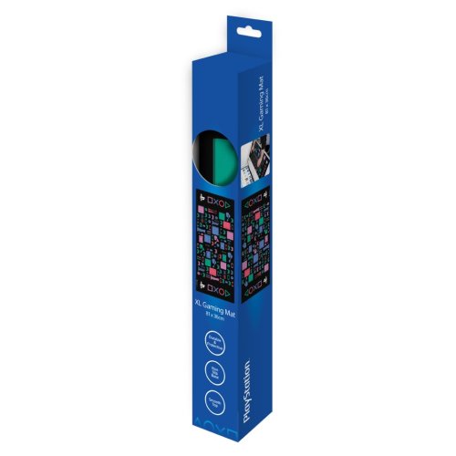 Produkt je balen v elegantní modré krabičce s průhledným okénkem, které umožňuje nahlédnout na barevný vzor podložky. Obal obsahuje informace o rozměrech a základních vlastnostech, jako je například snadná údržba a odolnost materiálu. Tato herní podložka je vhodným doplňkem pro fanoušky Playstation a hráče, kteří hledají nejen funkčnost, ale i vizuálně atraktivní prvek pro své herní prostředí.