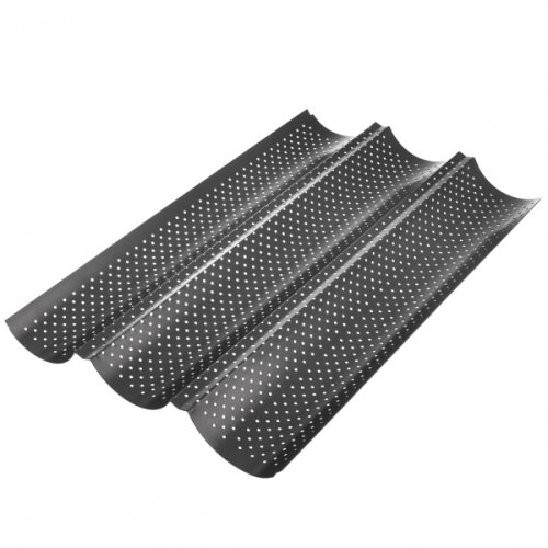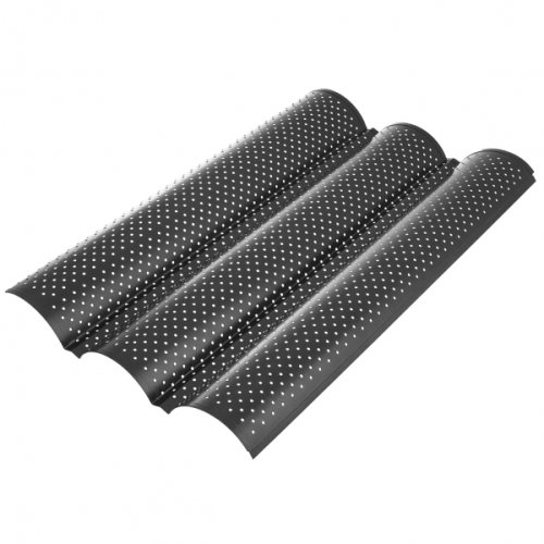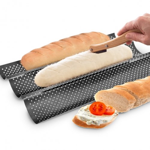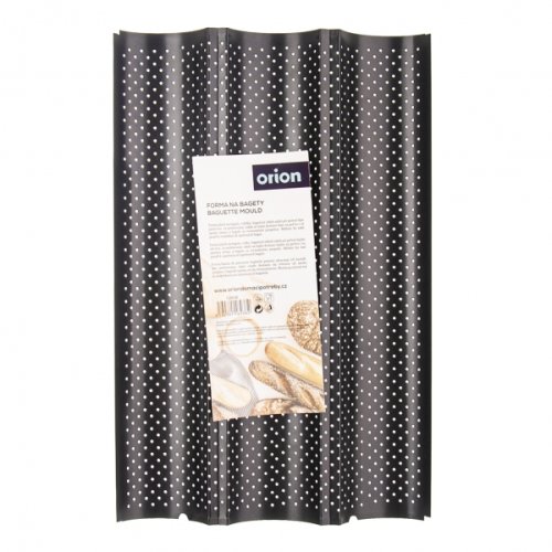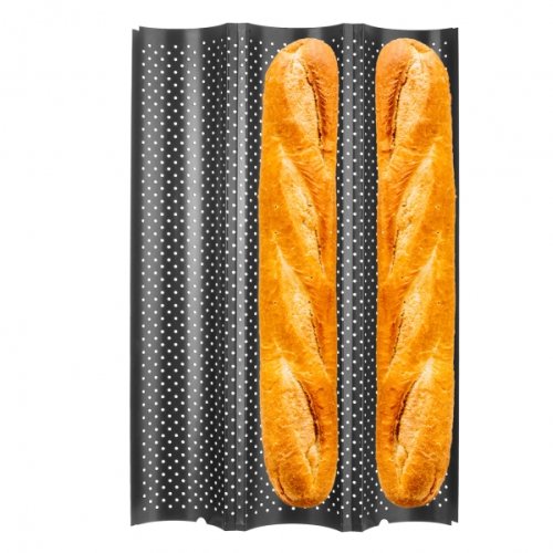 Forma / plech na bagety, rohlíky, bagetový chléb apod. Při pečení lépe udrží jejich tvar. Perforované provedení zaručení rovnoměrné propečení. Je vhodný i pro rozpékání již upečených baget a pečiva. Kovový materiál s nepřilnavým povrchem. Rozměr 38 x 24.5 x výška 2.5 cm. EAN 8592381162382