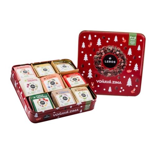 Vychutnejte si zimní pohodu s naší směsí bylinných čajů Voňavá zima, která je balena v nádherné plechové dárkové krabici.