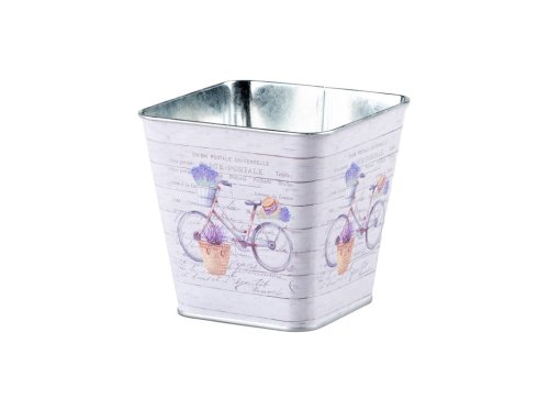 Hranatý plechový květináč s motivem kola, ideální pro moderní styl zahrady. Jeho rozměry jsou 125x125x120mm.