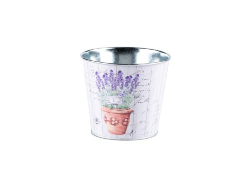 Plechový květináč s elegantním motivem levandule, ideální pro vytvoření příjemné atmosféry ve vaší zahradě nebo interiéru. Jeho rozměry jsou 133x115mm.