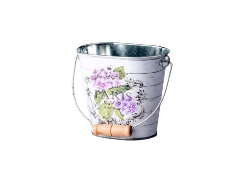 Oválný plechový květináč s uchem a motivem Paříže, ideální pro všechny, kteří milují francouzský šarm. Jeho rozměry jsou 125x80x110mm.