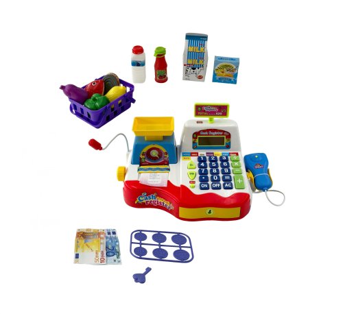 Doplňky pro reálný zážitek: K pokladně patří i sada dětských peněz (bankovky a mince), nákupní košíček a imitace potravin (nákup), takže si děti mohou ihned začít hrát na obchod.