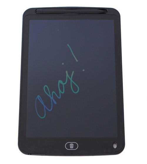 Kreslící tabulka - tablet. Přiloženou tužkou nakresli obrázek na tabulku a zmáčknutím jednoho tlačítka ho smaž. Tabulka je ve tvaru úzkého tabletu. Je moderní a designová. Má barevný podklad - nakreslené obrázky jsou na ní barevné. Velikost 10,5 palce.