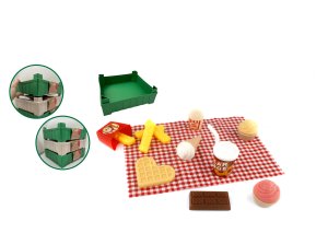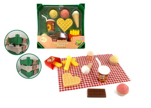 Sladké pohoštění: Sada obsahuje vše, co potřebujete pro sladké piknikové posezení. Děti si mohou připravit a "servírovat" různé dezerty, které vypadají jako skutečné.
