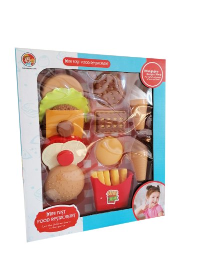 Sada plastových potravin, které se prodávají ve Fast Foodech. Hamburgery, hranolky, zmrzliny..