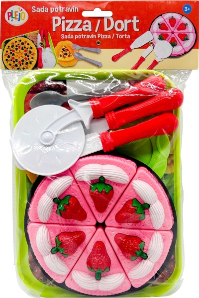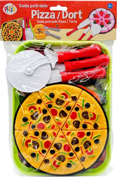 Sada plastových potravin, Pizza nebo dortTato multifunkční sada potravin od značky PLEJO nabízí dětem kreativní hru na kuchaře, a to hned se dvěma oblíbenými jídly – pizzou a dortem. Hlavní část sady tvoří buď pizza, nebo dort, které jsou navrženy tak, aby se daly rozřezat na šest stejných kousků, a to díky suchému zipu, který drží díly pohromadě.
