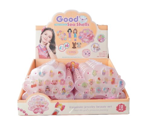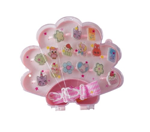 Sada prstýnků v krabičce ve tvaru mušle. Sada obsahuje 15 nastavitelných prstýnků s různými obrázky.