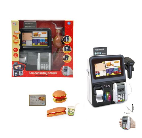 Platební terminál: Až si zákazník vybere, přijde na řadu terminál. Můžeš si hrát, že platí kartou nebo třeba mobilem! Prostě přiloží a píp! – penízky jsou "zaplacené" a může si odnést svou objednávku.