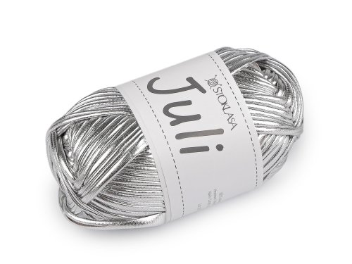 Příze Juli má efektní metalický lesk, který dodá exkluzivitu každému výrobku. Příze je elastická a měkká a dobře se s ní pracuje. Můžete z ní uplést či uháčkovat kabelky, batůžky, košíčky, peněženky, ale dají se z ní tvořit i zajímavé šperky. Šíře příze v nataženém stavu je cca 17 - 20 mm. Velikost jehlic: 5 - 6 Velikost háčku: 6