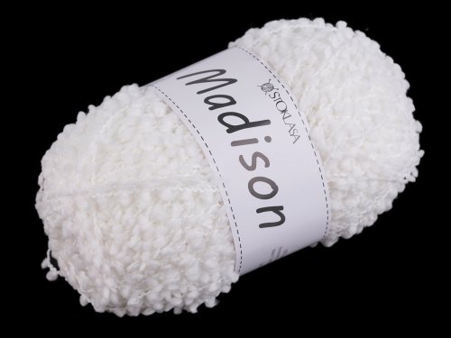 Příze Madison zaujme pozornost malými nopky, které dodají hotovému výrobku nevšednost. Můžete z ní uplést šály, svetříky, vesty apod. Velikost jehlic: 4 - 5 Pokud přízi budete párat, je nutné postupovat velice opatrně, aby se nepoškodila. Před pletením doporučujeme udělat zkušební vzorek.