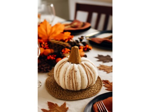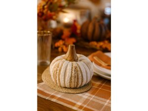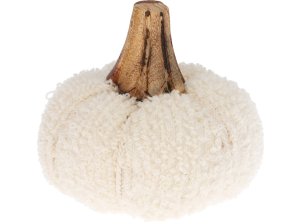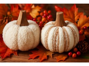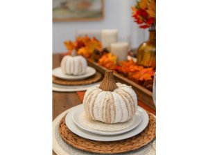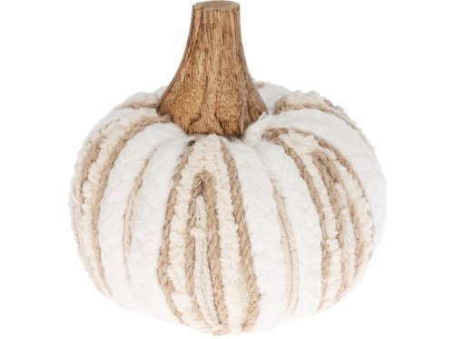 Ruční vzhled, hebká bavlna, tlumené tóny bílé a hnědé – tyto pletené dýně jsou stylovou alternativou ke klasické keramice. Skvěle vypadají v duetu i ve skupině s přírodními materiály.