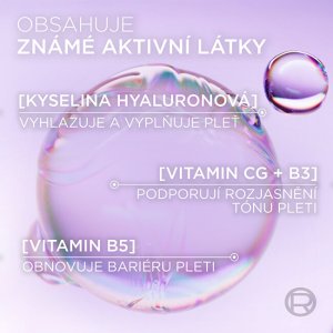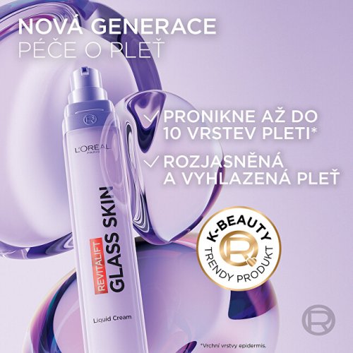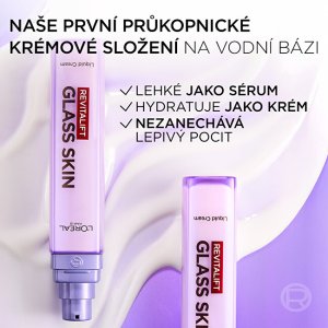 Revitalift Filler Glass Skin krém na vodní bázi rozjasňuje, intenzivně hydratuje a vyživuje pleť. Inovativní složení obsahující unikátní směs kyselin hyaluronových (makro a mikro) a vitamínů B3, B5 a C proniká až do 10 vrstev pleti, dodává intenzivní hydrataci a vyplňuje pleť. Redukuje výskyt jemných linek a vrásek a zároveň zvyšuje zářivost a lesk. Glass skin je trend inspirovaný z korejské kosmetiky, pokožka je sjednocená, jako by byla ze skla.