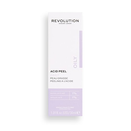 Acid Peeling Solution od Revolution Skincare je ošetření pleti, které exfoliuje svrchní vrstvy pokožky. Tento peelingový roztok obsahuje 1% soli kyseliny azelaové, který čistí pokožku, pomáhá odlupovat odumřelou kůži, aby pokožka byla svěžejší a hladší. Vyrovnává tón i texturu pleti a reguluje tvorbu kožního mazu. 1% kyseliny salicylové - BHA, která pomáhá proniknout peelingu hluboko do pórů, aby pleť nebyla přetížená a předešlo se praskání, takže pak vypadá hladší a zářivější.