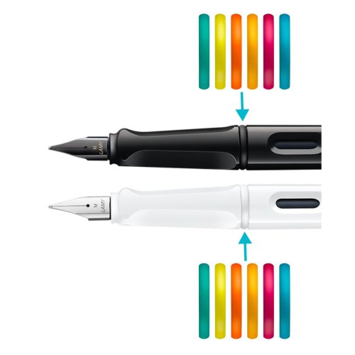 PLNICÍ PERO:, * ergonomicky upravená úchopová zóna, * odpružený kovový klip v bílé barvě, * nasazovací víčko, * souprava obsahuje pero LAMY safari a šest barevných kroužků, * možnost použití jak inkoustových bombiček, tak i plnění pera inkoustem z lahvičky, Dodáváno s jednou bombičkou.