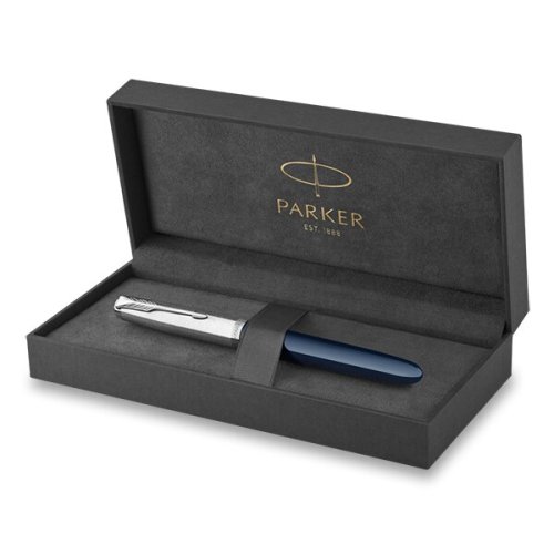 Tělo z ušlechtilé, temně modré pryskyřice a víčko z nerezové oceli s korunkou pokovenou palladiem. V kombinaci s doplňky pokovenými palladiem. Hrot z ušlechtilé nerezové oceli., Vlastnosti:, * Šroubovací víčko, * Hrot z nerezové oceli, * Dvoukanálkový systém zásobování hrotu inkoustem, * Přizpůsobeno k používání inkoustových bombiček nebo konvertoru (není součástí balení), * Dodáváno s modrou i černou bombičkou, Stejně jako v roce 1941, kdy byl Parker 51 poprvé uveden, i dnes se jedná o průlomový a v mnoha směrech originální psací nástroj. Inspirovaný perem kdysi označovaným jako, nejžádanější na světě, si uchoval aerodynamický tvar i ikonický překrytý hrot. Také volba barevných provedení navazuje na barvy, které Parker používal v minulosti. Pero je vyrobeno z, odolné ušlechtilé pryskyřice a pozornost je věnována každému detailu – víčko i další části pera zdobí prvky z drahých kovů, jednotlivé díly jsou sestavovány ručně. Současný, Parker 51 je inspirovaný minulostí, ale stvořený pro budoucnost., TIP: K plnicímu peru byste mohli využít konvertory Parker s lahvičkovým inkoustem nebo inkoustové bombičky Quink., TIP: JAK VYČISTIT PLNICÍ PERO?, JAK SE LIŠÍ HROTY F A M?, F - Slabý hrot (Fine) - Vhodný pro běžné psaní a poznámky. Mírný tlak vytváří jemnou linku. Velmi oblíbený, vhodný pro uživatele se standardním rukopisem., M - Střední hrot (Medium) - Průměrný tlak a šíře linky. Vhodný pro uživatele, kteří mají rádi maličko silnější linku.