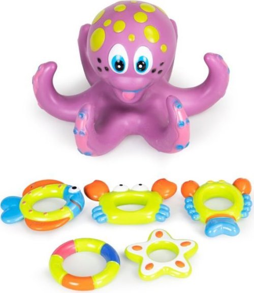 Chobotnice + 5 kroužků: krab, ryba, rak, hvězdice a plavecký kruh. rozvoj koordinace oko-ruka, vhodné pro zpestření koupání, vhodné od narození.