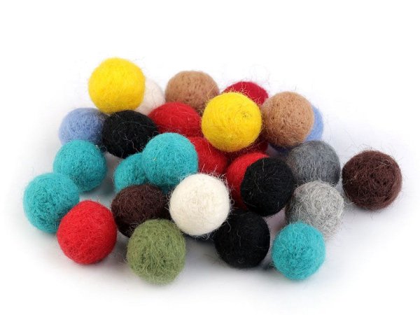 Barevný mix plstěných kuliček z pravého ovčího rouna. Výhodou těchto kuliček je lehký a příjemný přírodní materiál a výrazné barvy. [Uvnitř jsou zpevněné malou polystyrenovou kuličkou.] Použití: Bambulky jsou vhodné na výrobu náhrdelníků, náušnic, náramků nebo přívěsků na klíče a mobil. Můžete si s nimi i originálně ozdobit čepice, šály, svetry nebo kabelky.
