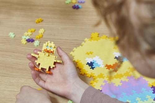 Kreativní sada PLUS-PLUS Skládej podle čísel Kuřátko obsahuje 250 dílků. Vytvořit lze roztomilé kuřátko vylézající z vajíčka, případně trojrozměrné kuřátko a dvojrozměrné vajíčko. Obrázky můžete využít jako dekorace.
