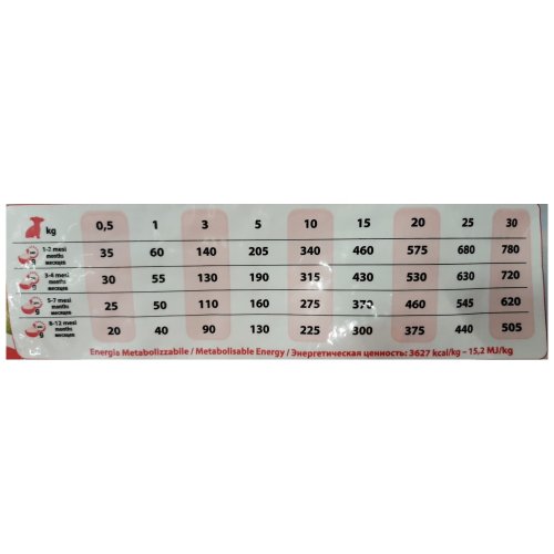Metabolizovaná energie: 3600 kcal/kg (15,07 MJ/kg).